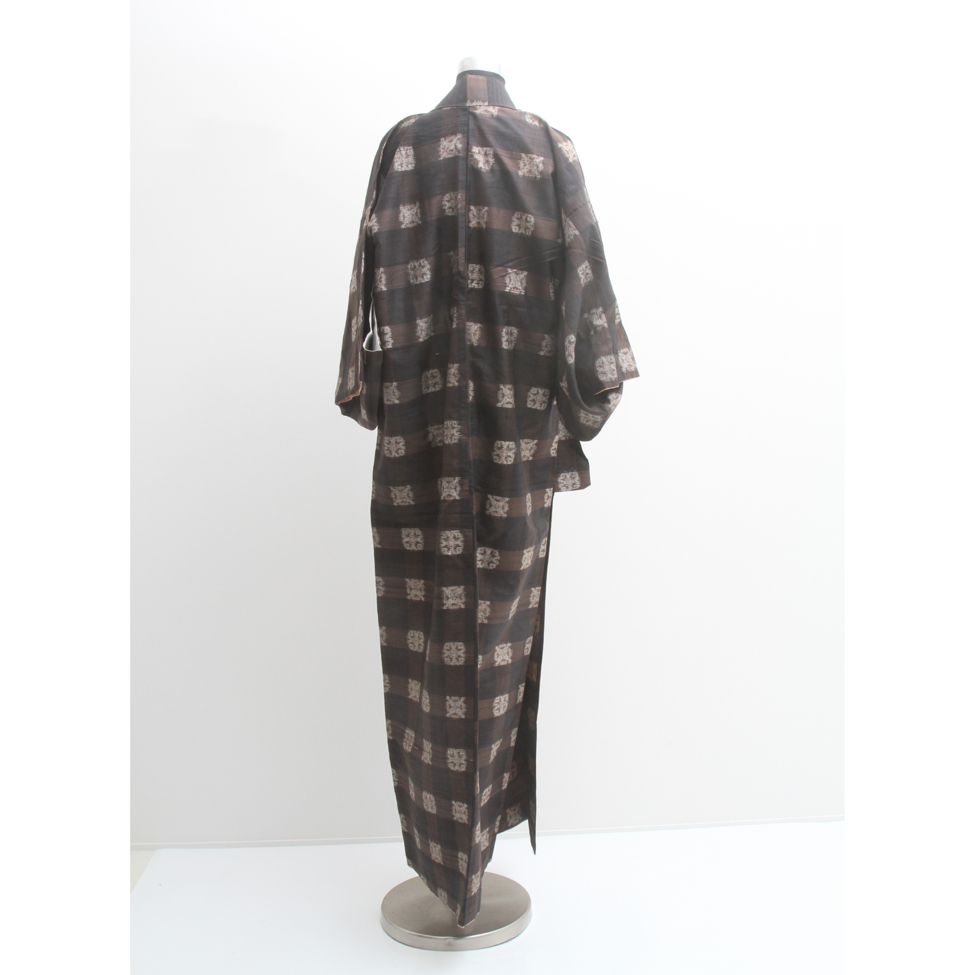This pre-owned kimono is crafted from traditional Tsumugi silk, known for its soft texture and rustic woven character. It features a classic checked kasuri (ikat) pattern in subdued earthy tones, giving it a timeless and understated elegance.